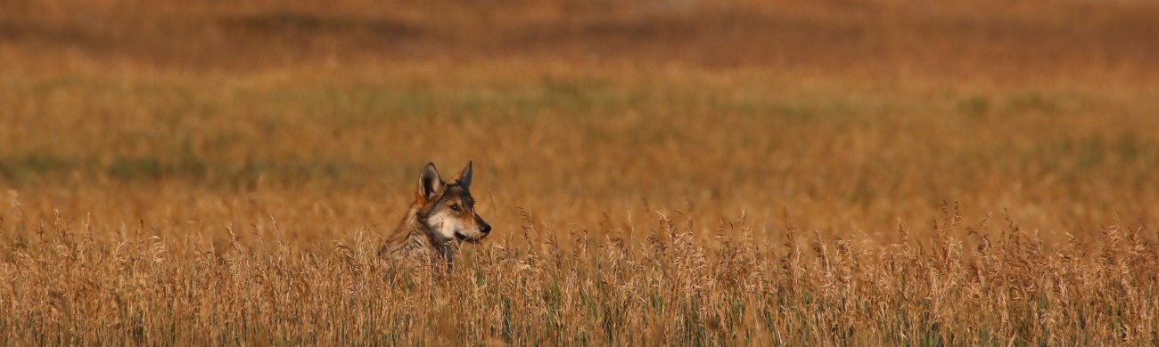 A wolf pup from the Pinnacle Peak pack peeks its head out of the grass at the National Elk Refuge.