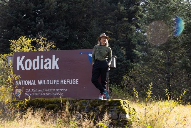 A woman stands near the entrance sign at Kodiak Refuge in Alaska.