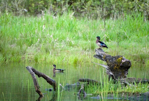 A pair of male wood ducks grace the waters on William L. Finley National Wildlife Refuge