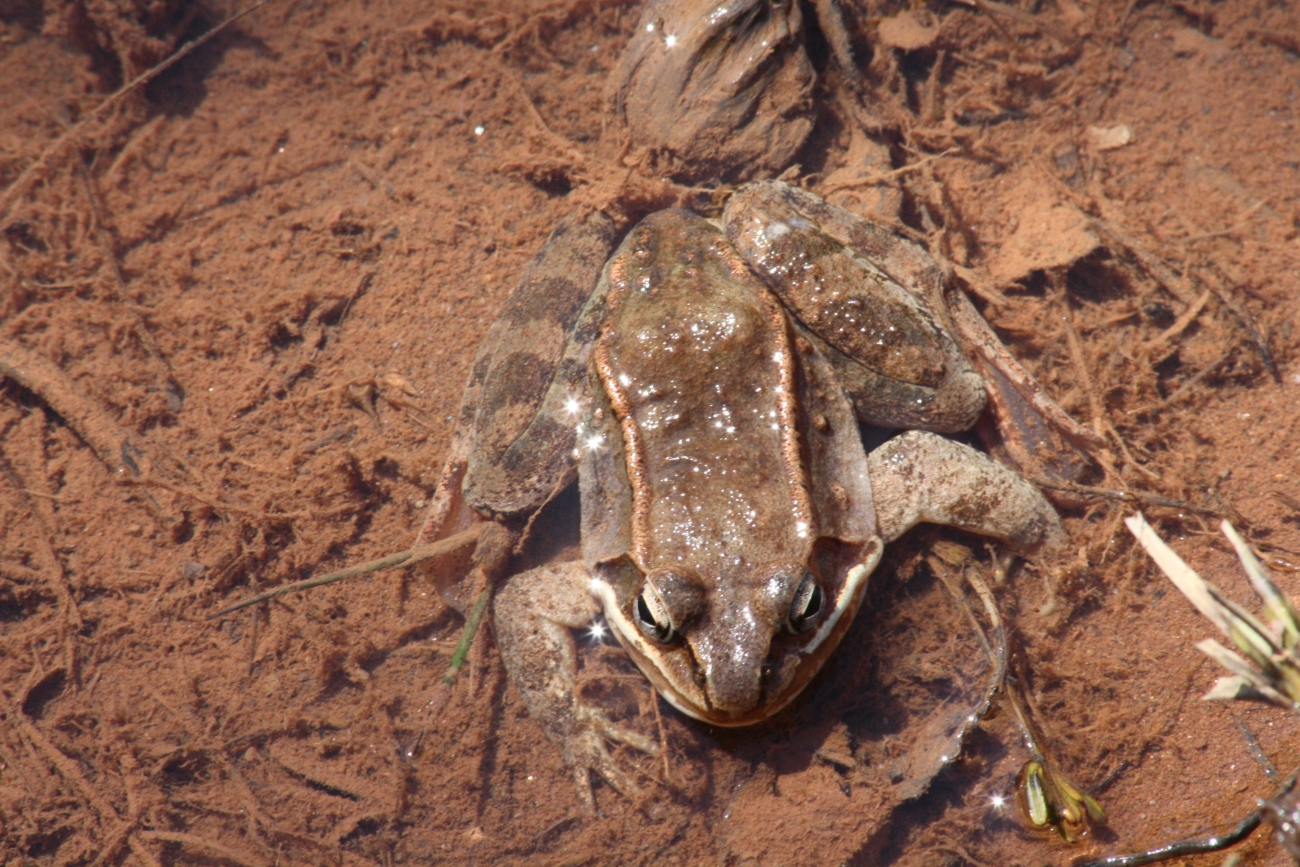Wood frog resting in the mud, half-submerged in the water