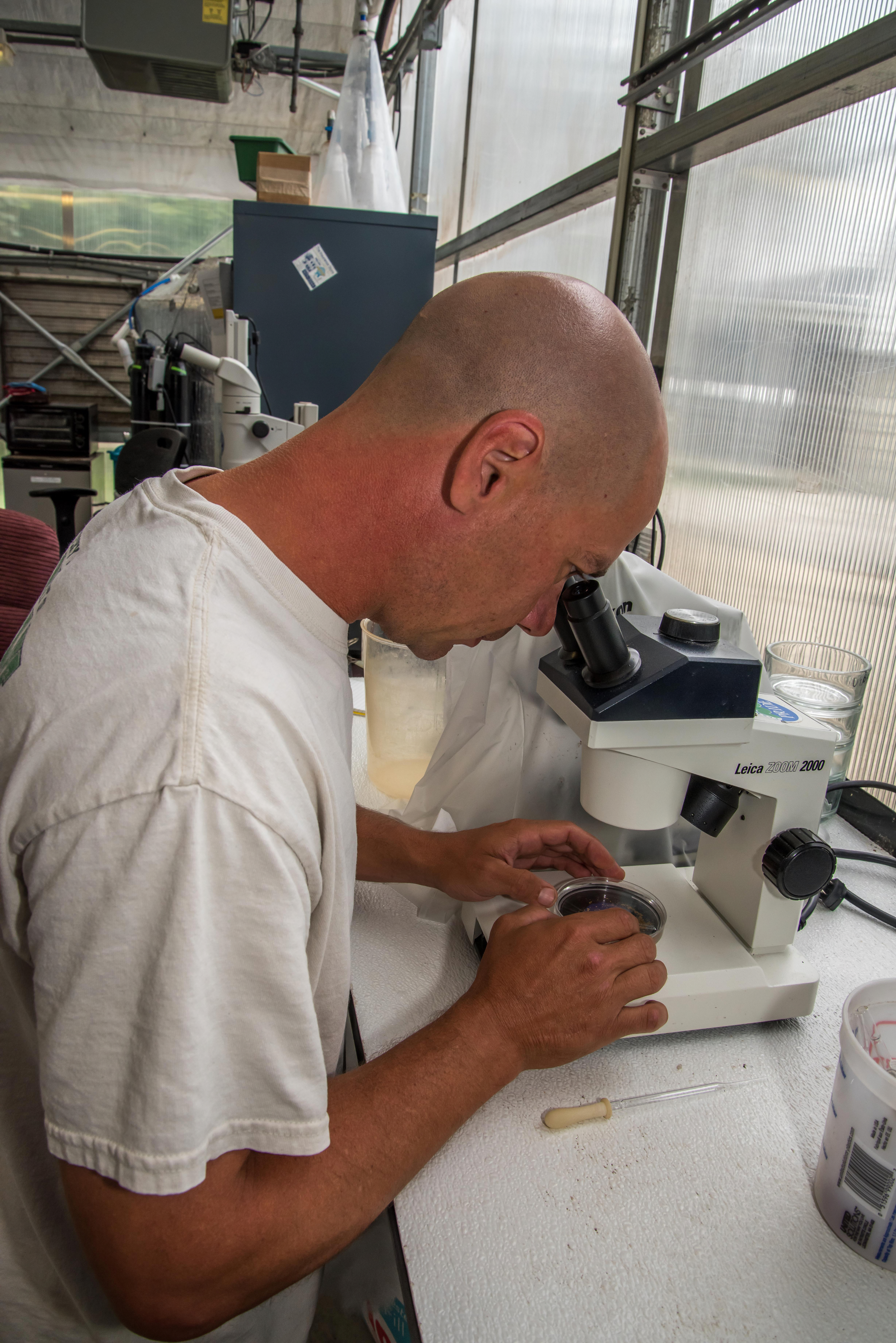 Kentucky Department of Fish and Wildlife Resources Center worker checks on juvenile mussels.