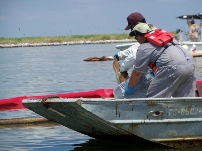 Workers helped clean the oil spill in Barataria Bay off Grand Isle, LA.