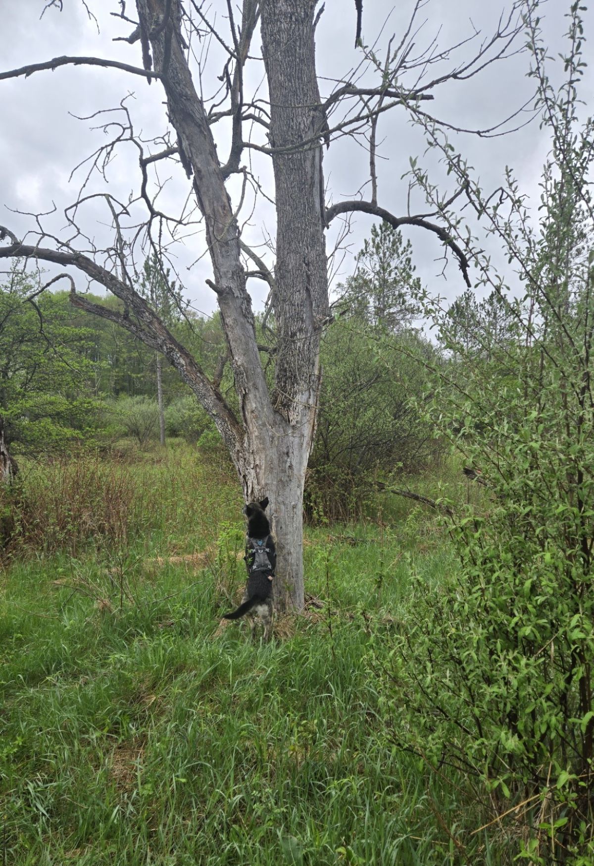 Sky, a working scent detection dog, searches for bat guano in a tree during a training exercise.
