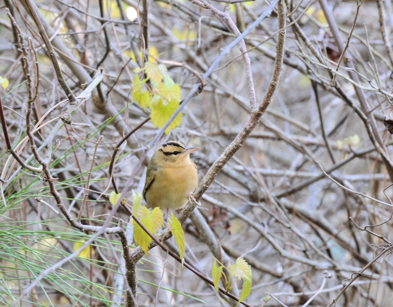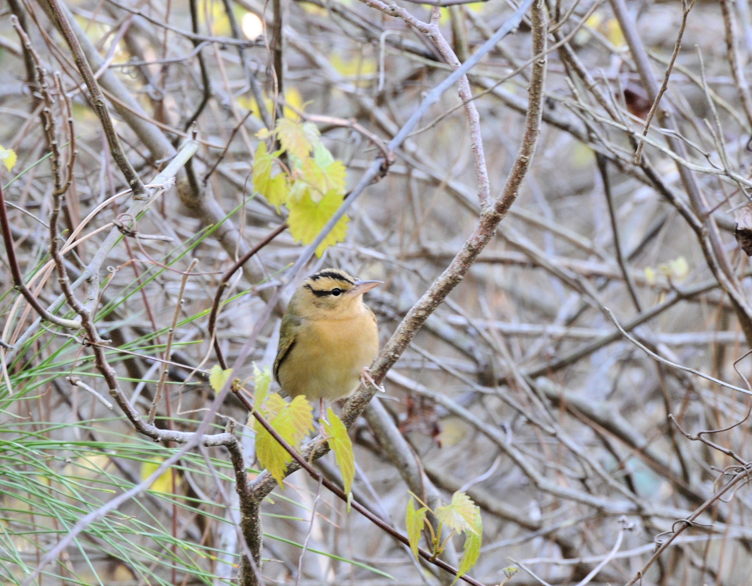 Worm-eating Warbler sitting on branch in the underbrush of Bon Secour National Wildlife Refuge.