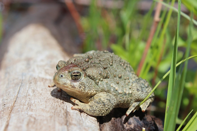 A Wyoming toad basks in the sun. It sits on a log next to green grasses.