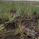 A Wyoming toad sits in a muddy clearing surrounded by thick green grasses. The sky is cloudy and blue, and water can be seen in the distance peeking between the grass.