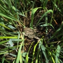 A photo of an adult Wyoming toad surrounded by thick tall green grasses.