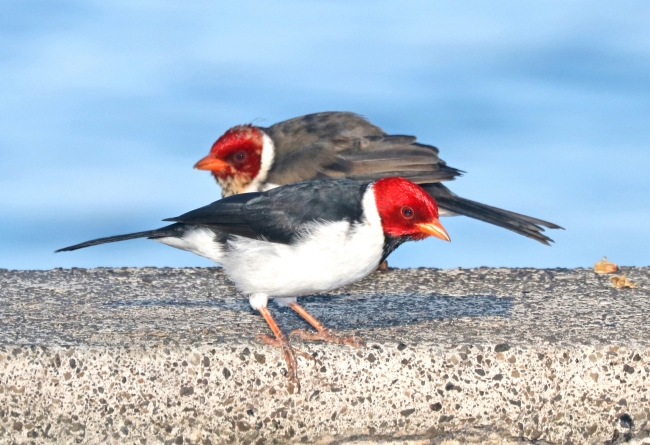 Yellow-billed Cardinal with juvenile, Keauhou Bay, Kona Coast, Hawaii Co, Hawaii.
