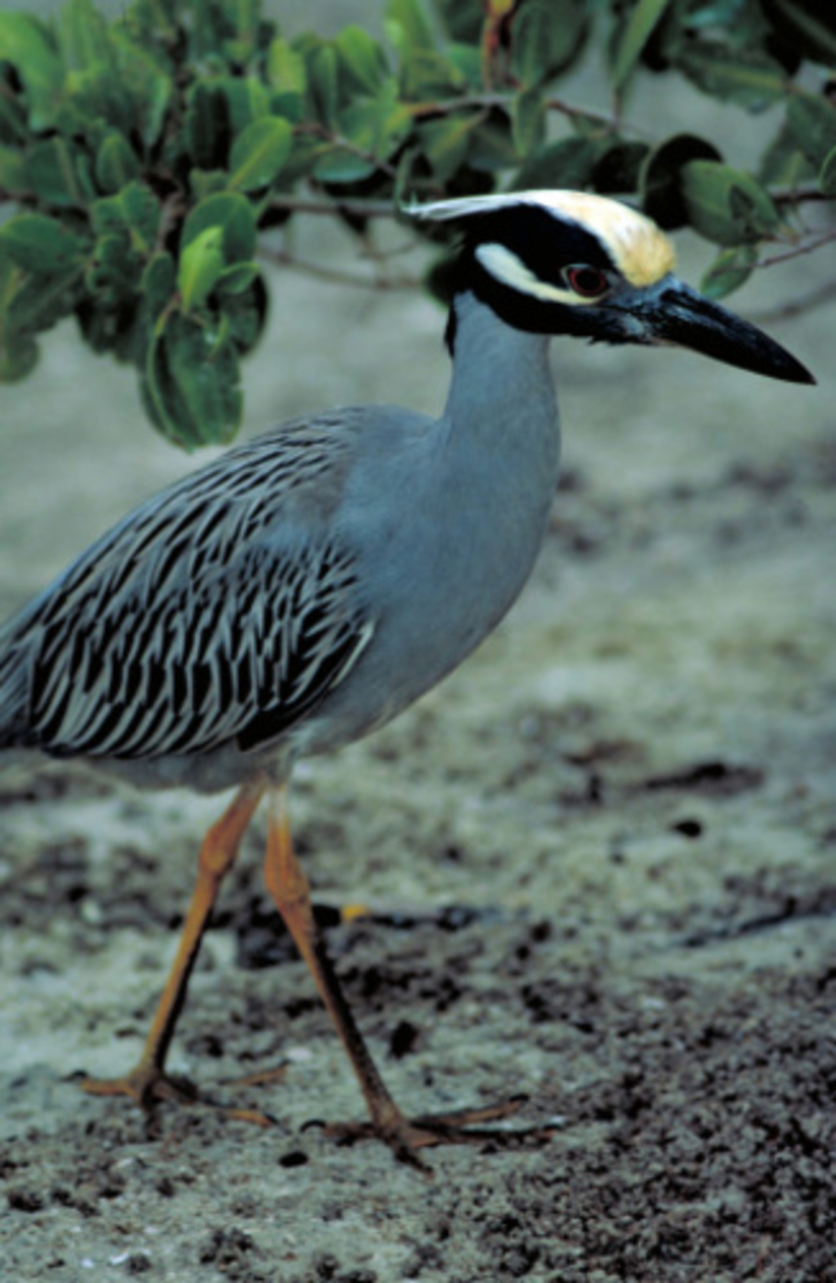 Yellow-crowned night heron walking in mangroves in Florida. Often hidden, these wading birds roost in trees along beaches, woods and swamps.