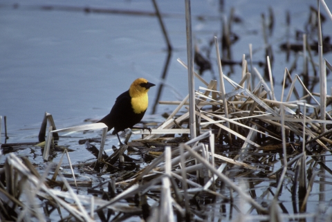 A close view of a striking Yellow-headed Blackbird in the J. Clarke Salyer National Wildlife Refuge located in Upham, North Dakota.