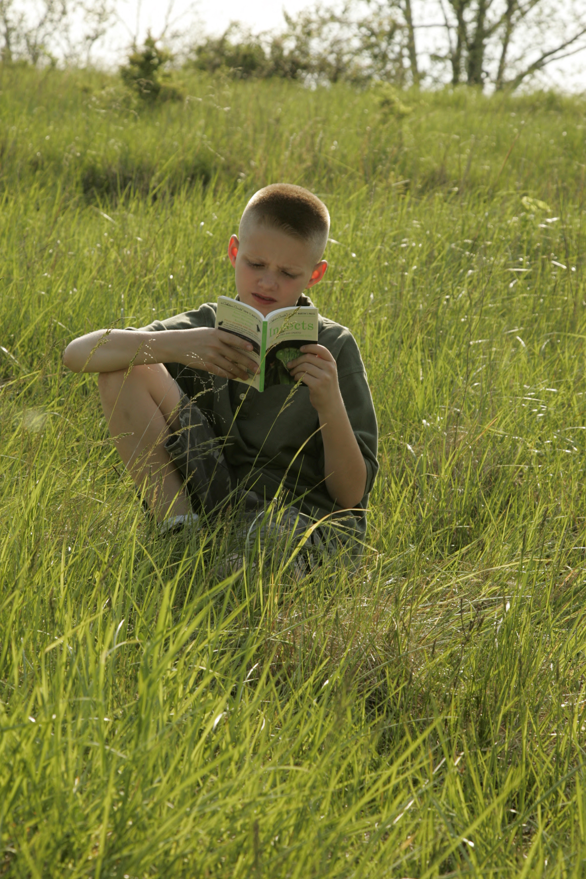 Young boy is reading a book in a field of grass