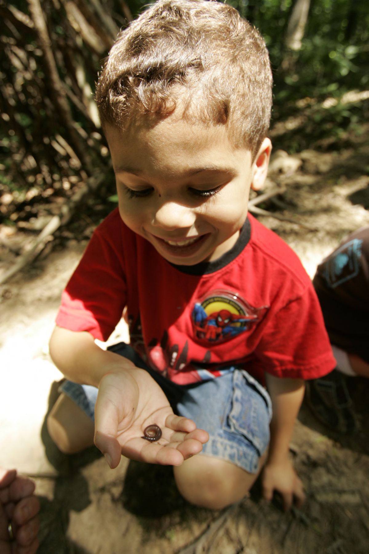 Young boy shows a worm he found