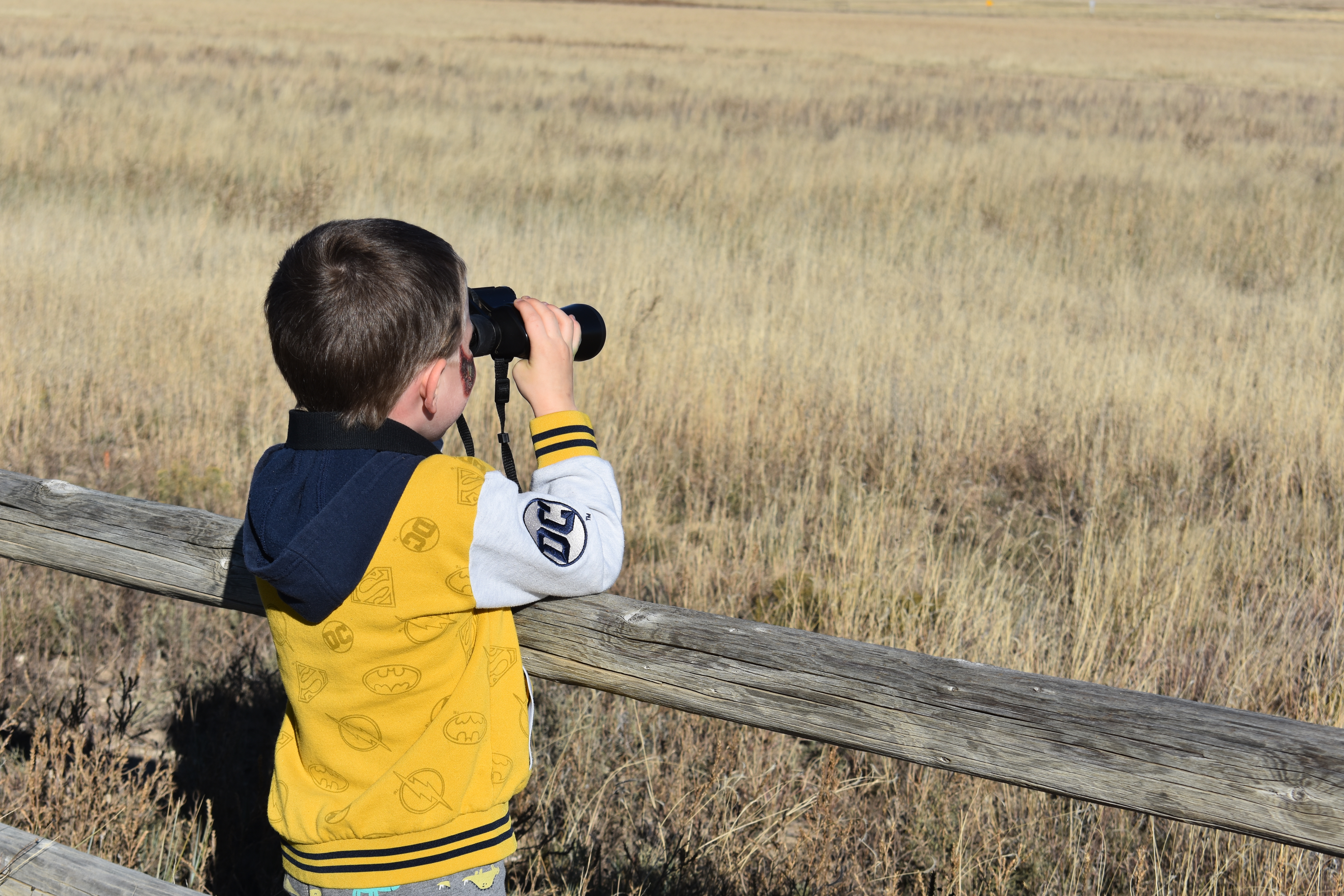 A young boy using binoculars
