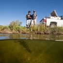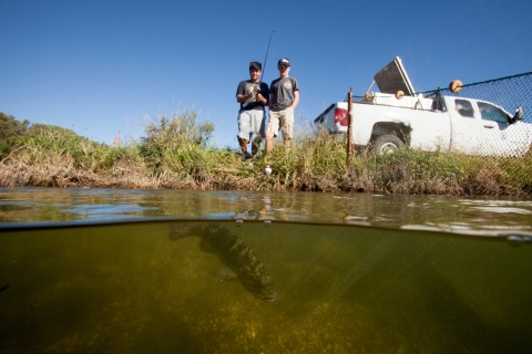 Half submerged photograph of young boys fishing for Smallmouth bass.