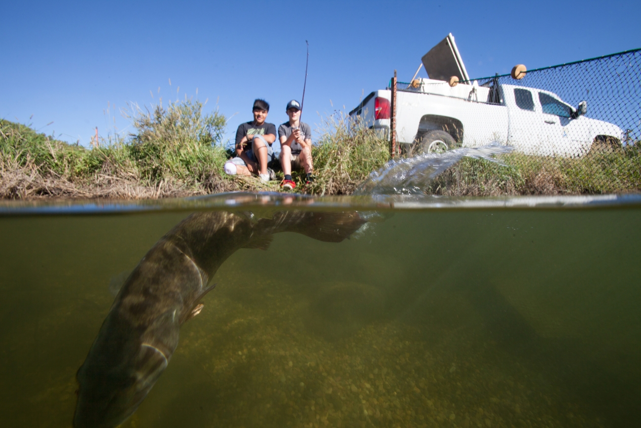 Half submerged photograph of young boys fishing for Smallmouth bass.