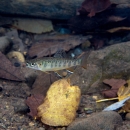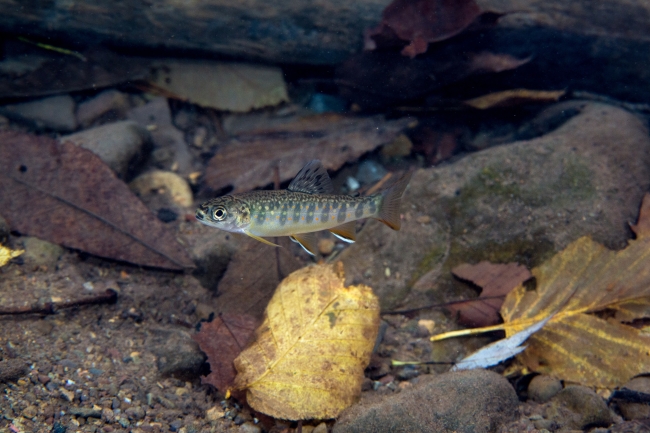Young brook trout with fall leaves in water