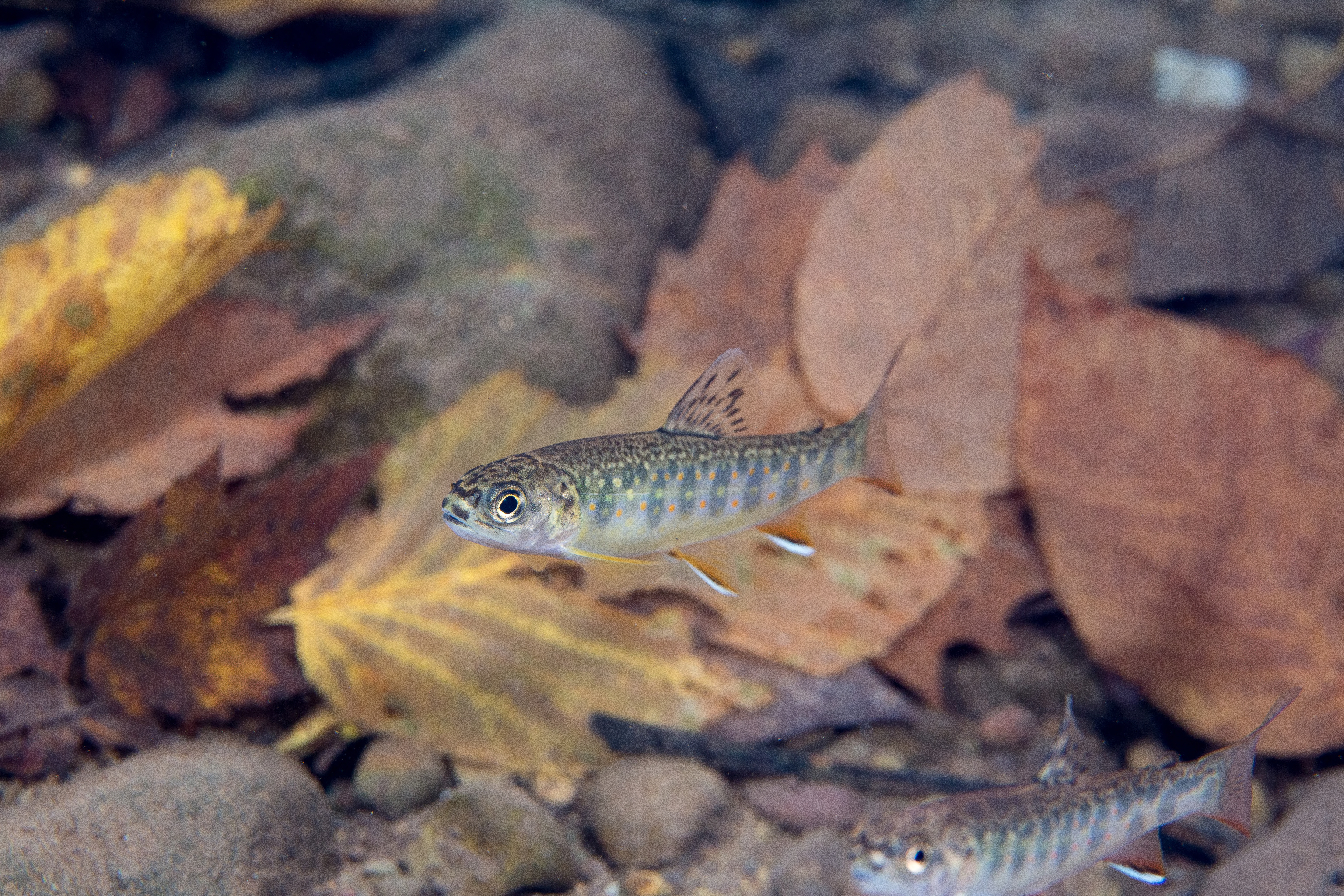 Young brook trout with fall leaves in water