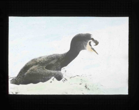 Hand painted glass slide of a young Double-crested Cormorant taken by Finley and Bohlman during a 1905 photography trip to Klamath Marsh.