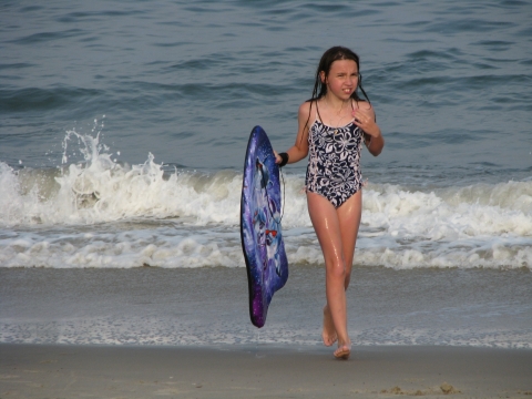 Young girl with boogie board walking onto the beach from the water