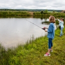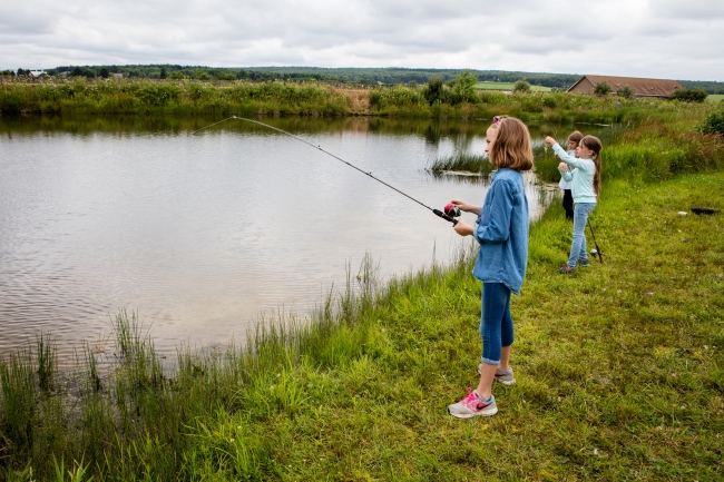 Young girls fishing on a pond bank in Western Maryland.
