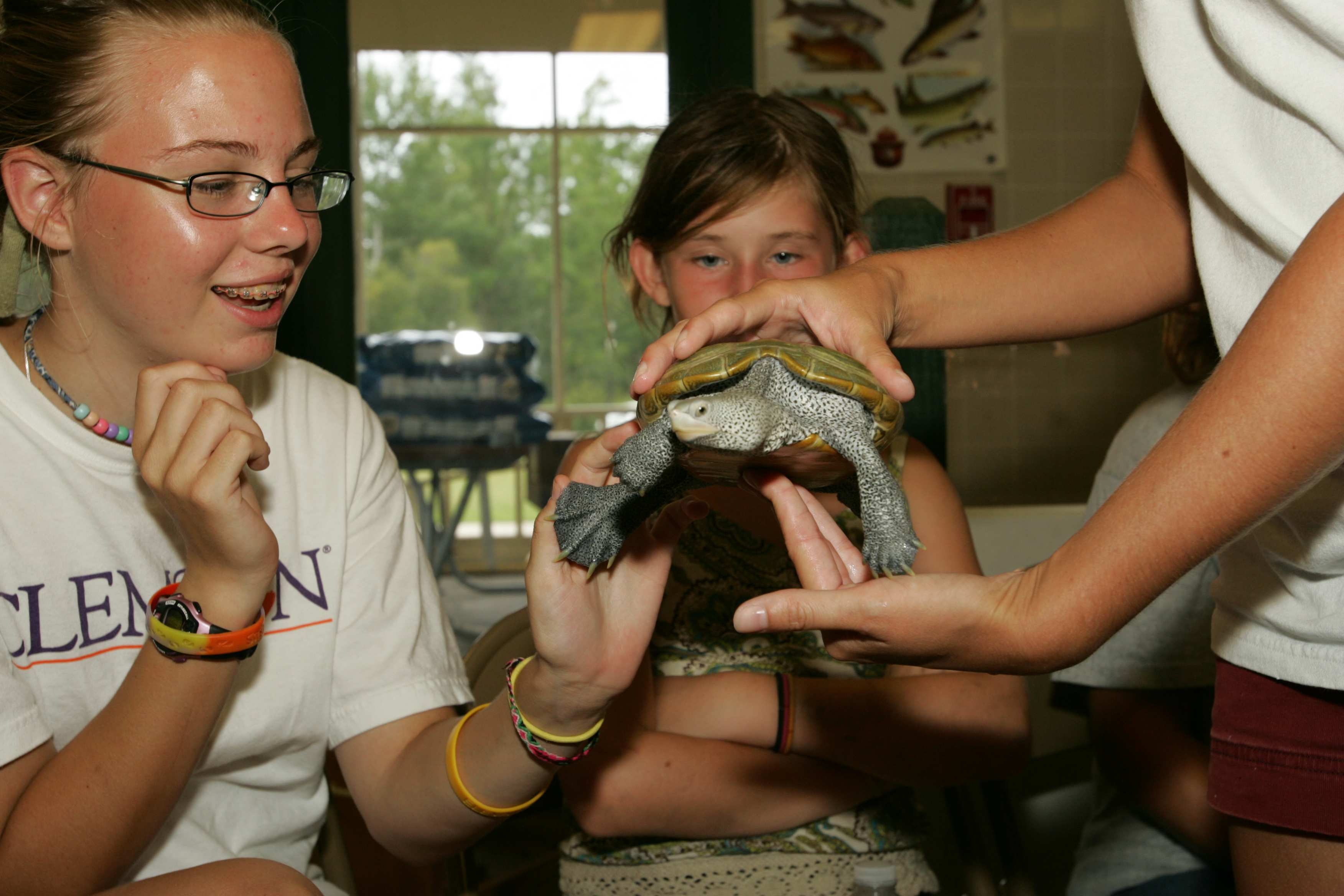Young girls learn about turtles