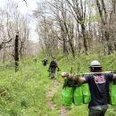 A work crew made up of government agency staff and university volunteers work to move young red spruce trees from the road into the forest where they'll be planted.