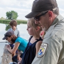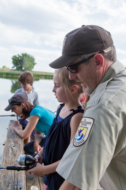 A refuge employee watches a young girl fish at the refuge.