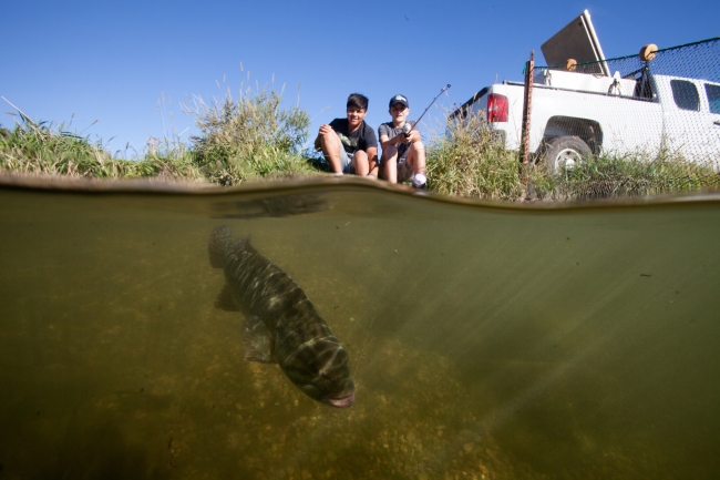 Underwater split shot of young boys fishing and a visible Smallmouth bass below the water line.