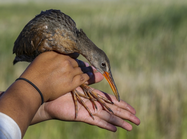 An endangered Yuma Ridgway’s rail in the hand of a field assistant. Credit: USFWS