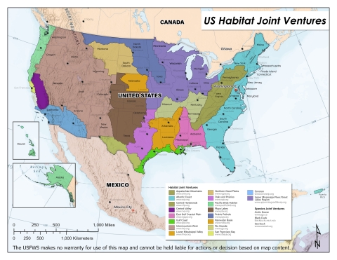 Migratory Bird Joint Ventures are collaborative, regional partnerships of government agencies, non-profit organizations, corporations, tribes, and individuals that conserve habitat for the benefit of priority bird species, other wildlife, and people. Joint Ventures bring these diverse partners together under the guidance of national and international bird conservation plans to design and implement landscape-scale conservation efforts in support of the North American Waterfowl Management Plan and the other bird management plans.