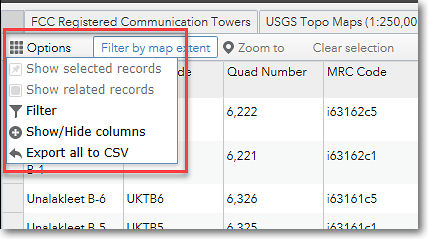 In addition to the main features of the Attribute Table tool, various other functions are available. These are accessed by clicking Options button in the upper-left corner of the Attribute Table window. Below is a screenshot showing the Options popup menu.