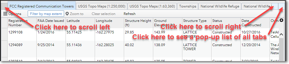 The tables of 18 data layers are displayed as individual tabs in the Attribute Table tool. You will not be able to see all 18 tabs on your display at one time. In order to see additional tabs, you will need to scroll left and right. Refer to the screenshot below.