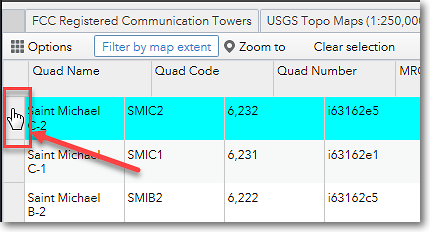 By default, all the features that are visible in the current viewing area for a data layer are displayed in the attribute table. If you want to focus only certain records in the attribute table, you can select those records. This is useful if you want to see only the selected records, zoom to them on the map, or export them to a file. To select a record, click on the blank space to the left of the first column. The record in the attribute table and it's corresponding feature in the map display will be highlighted with a cyan color.