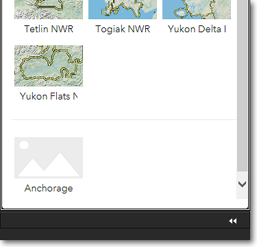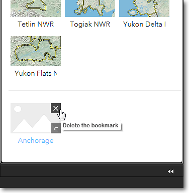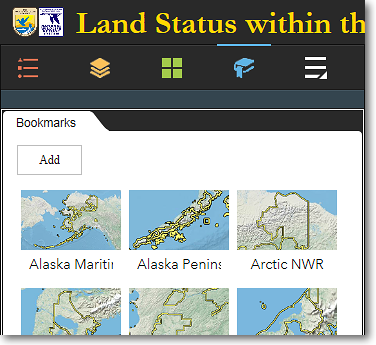 Bookmarks provide a quick and easy way to navigate to various geographic locations in the Mapper. Rather than manually panning and zooming, you can simply click a bookmark to go directly to the location defined by the bookmark. The Mapper has several default bookmarks - one for each National Wildlife Refuge in Alaska. You can also save your own bookmarks to make it easier to return to a previously-viewed location.
