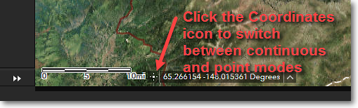 The default continuous mode displays a continuous readout of coordinates as you move the mouse cursor around the map. The point mode displays the coordinates of a location in the map that you click on.