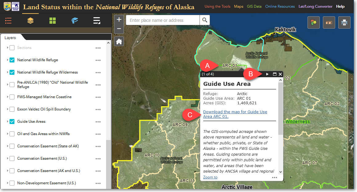 3) In the map area, click on the desired Guide Use Area (A). In the pop-up window, click the right-pointing arrow to advance to the Guide Use Area page (B) and then click on the download link (C).