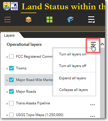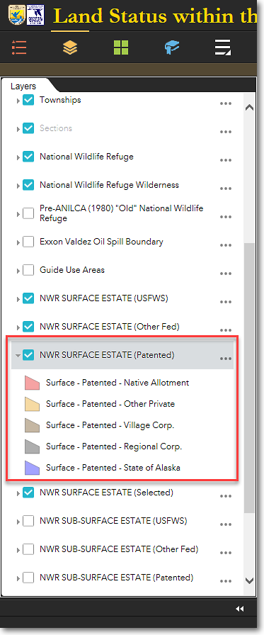 The Layers tool displays the various data layers that you can view in the Land Mapper.