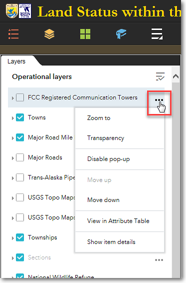 Layer Options Available for each Individual Layer You can perform the following functions via the individual layer menus: ⚫ Zoom to Zooms the map to the full extent of the layer ⚫ Transparency Allows you to set the level of transparency of the layer ⚫ Disable pop-up Turns off the pop-up information window that normally displays when you click on a layer feature in the map display ⚫ Move up Moves the layer up (toward the top) in the layer list ⚫ Move down Moves the layer down (toward the bottom) in the layer list ⚫ View in attribute table Displays the attribute table of the layer ⚫ Show item details Displays technical information about the layer |