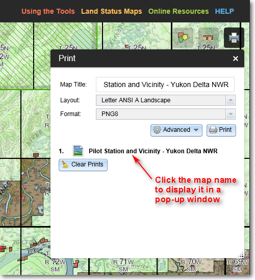 5) Set other options for your map by clicking the Advanced button. When you're ready to create the map, click the Print button. See below for examples.