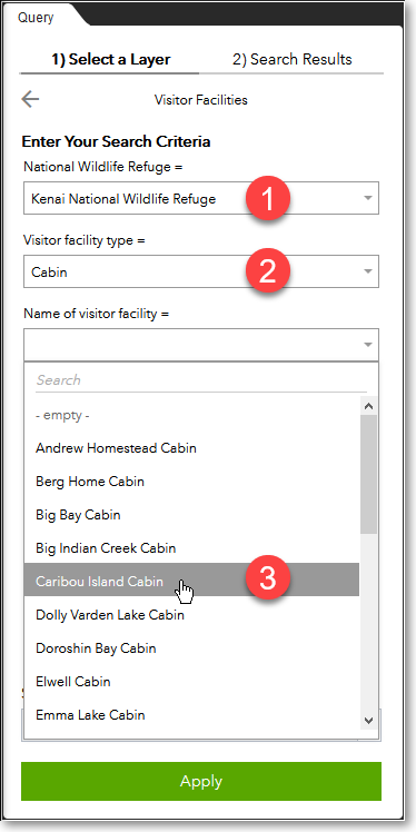In the above example, three search criteria have been specified. In this case, the user first selected Kenai National Wildlife Refuge (#1), then clicked on the Visitor Facility Type pick list. This pick list then showed all the various types of visitor facilities within only Kenai NWR, from which the user selected Cabin (#2). The visitor facility name pick list then presented a list of all the cabin names within Kenai NWR, and the user has selected the Caribou Island Cabin (#3). After specifying all of your desired search criteria, click the Apply button to perform the query.