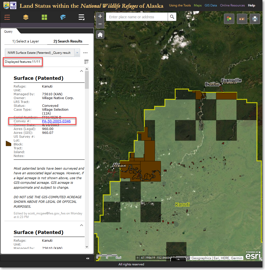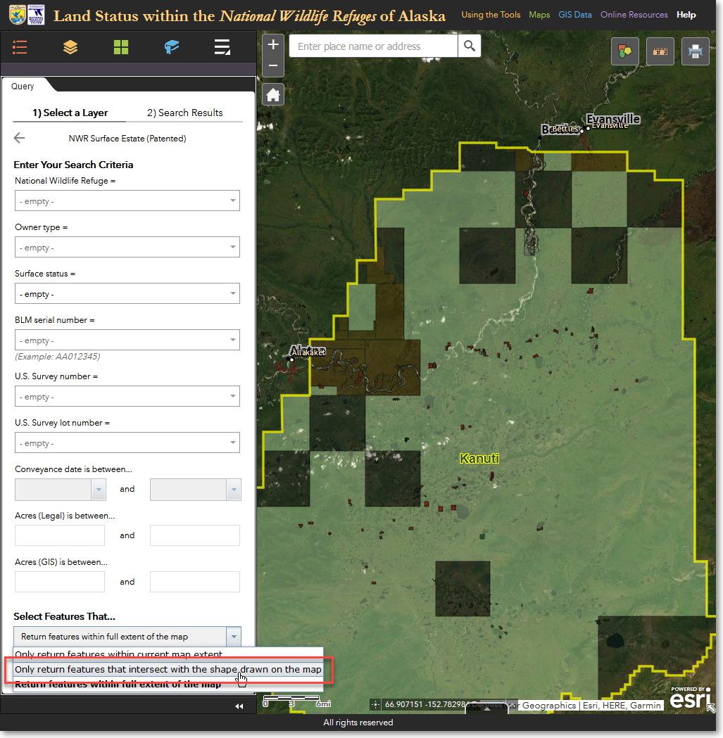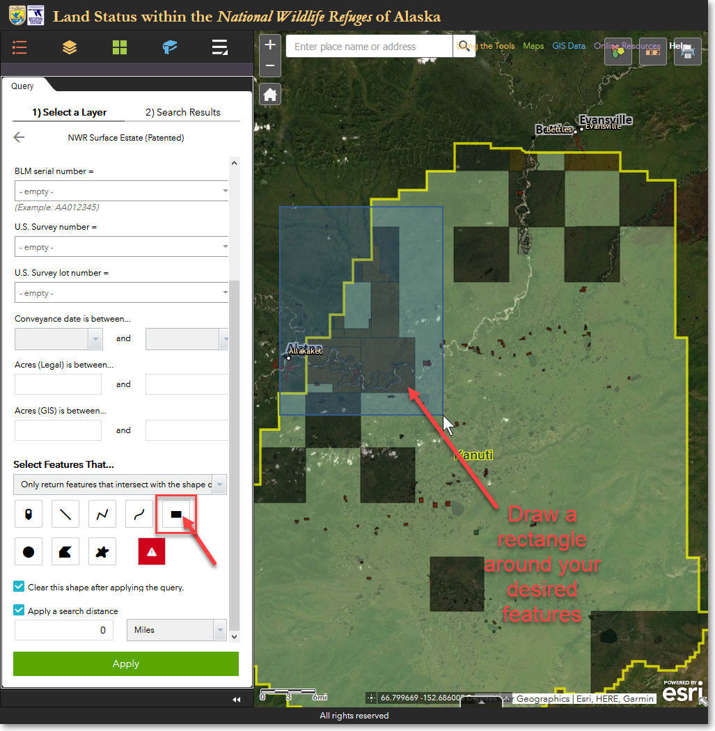 2) You now need to search for land that has been patented to Alaska native village corporations within Kanuti National Wildlife Refuge. Specify your search criteria as shown below, then click Apply.