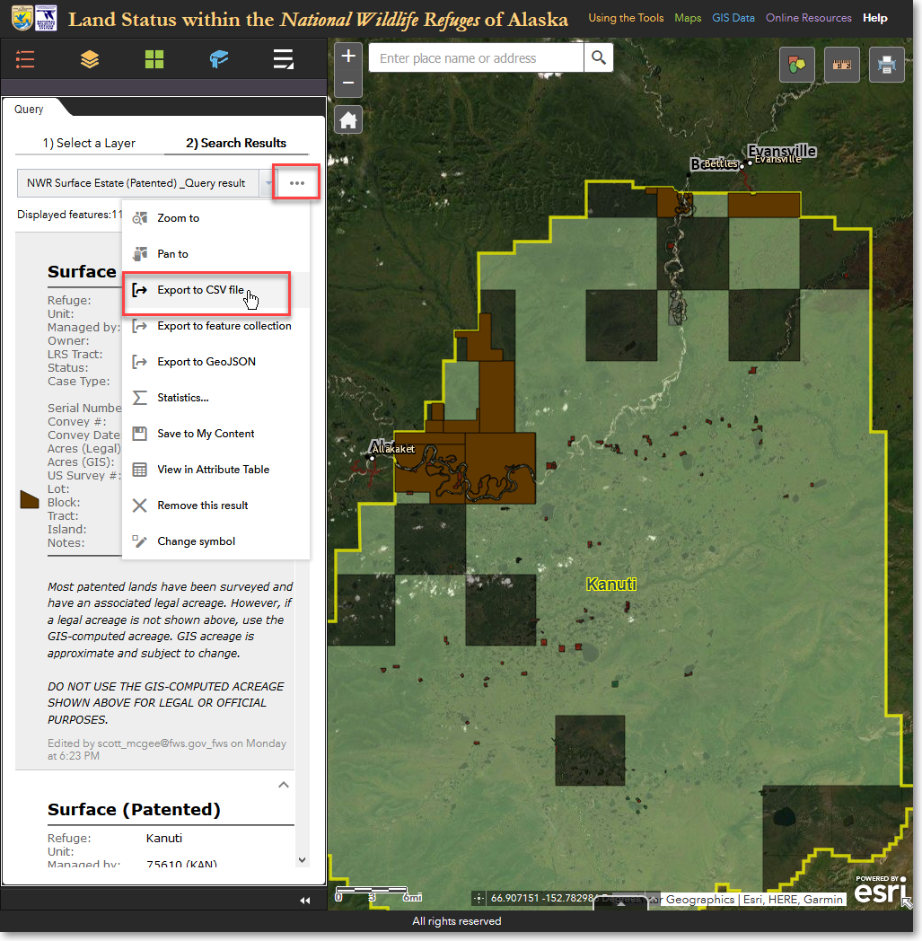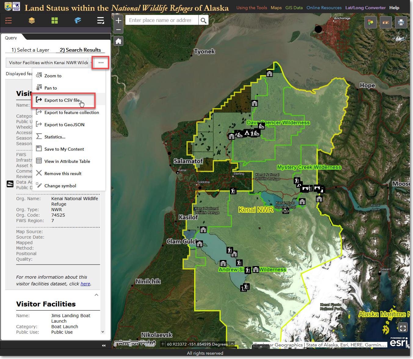 6) You can now scroll the list of visitor facilities, zoom and pan the map view, click individual facilities on the map, and perform additional actions accessed via the Feature Actions icon (three horizontal dots in the upper-right corner of the Query panel). In this tutorial, your goal is to generate a list of all the visitor facilities within the Kenai NWR wilderness areas. To generate this list, click the Feature Actions icon and select Export to CSV file. You can now either save the CSV file on your computer, or open it directly in an installed spreadsheet program.