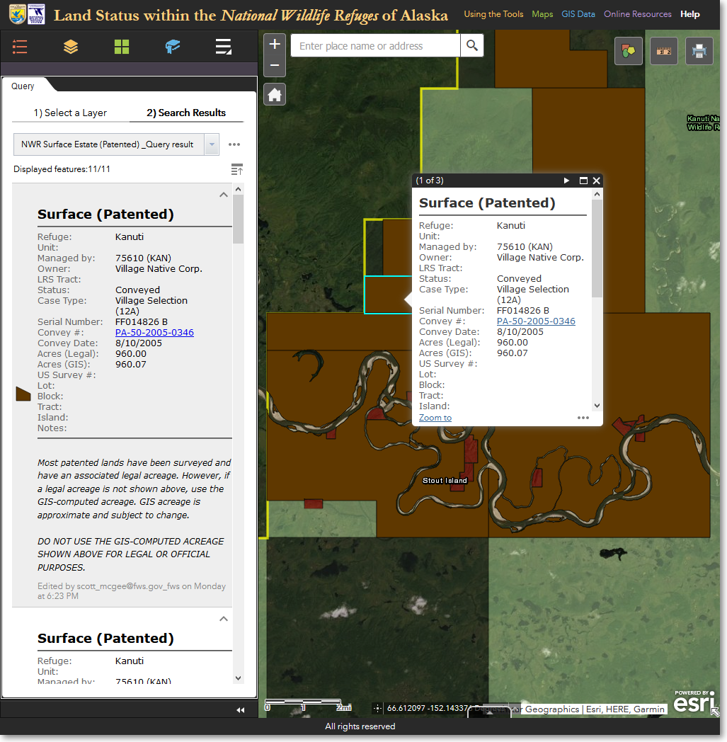 In this tutorial, you will calculate the acreage of surface estate land that is patented to Alaska native village corporations within Kanuti National Wildlife Refuge. You will first perform a database query to select the parcels that meet your criteria. You will then examine the statistics of the selected parcels to determine the acreage. Finally, you will export the information for the selected parcels into CSV format for use with other programs outside of the Land Mapper.