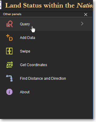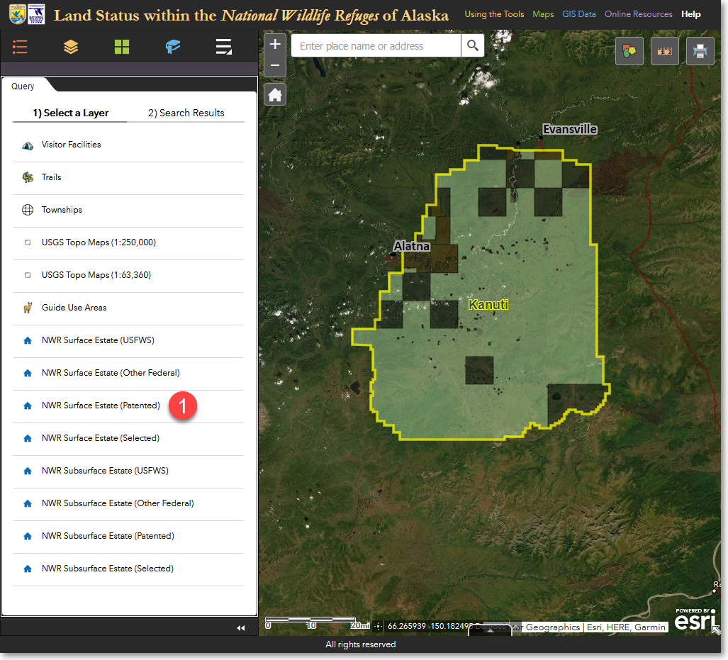 1) With the Query panel open, under 1) Select a Layer, click on the NWR Surface Estate (Patented) layer. This layer contains all of the surface estate that has been patented within all 16 of the National Wildlife Refuges in Alaska.