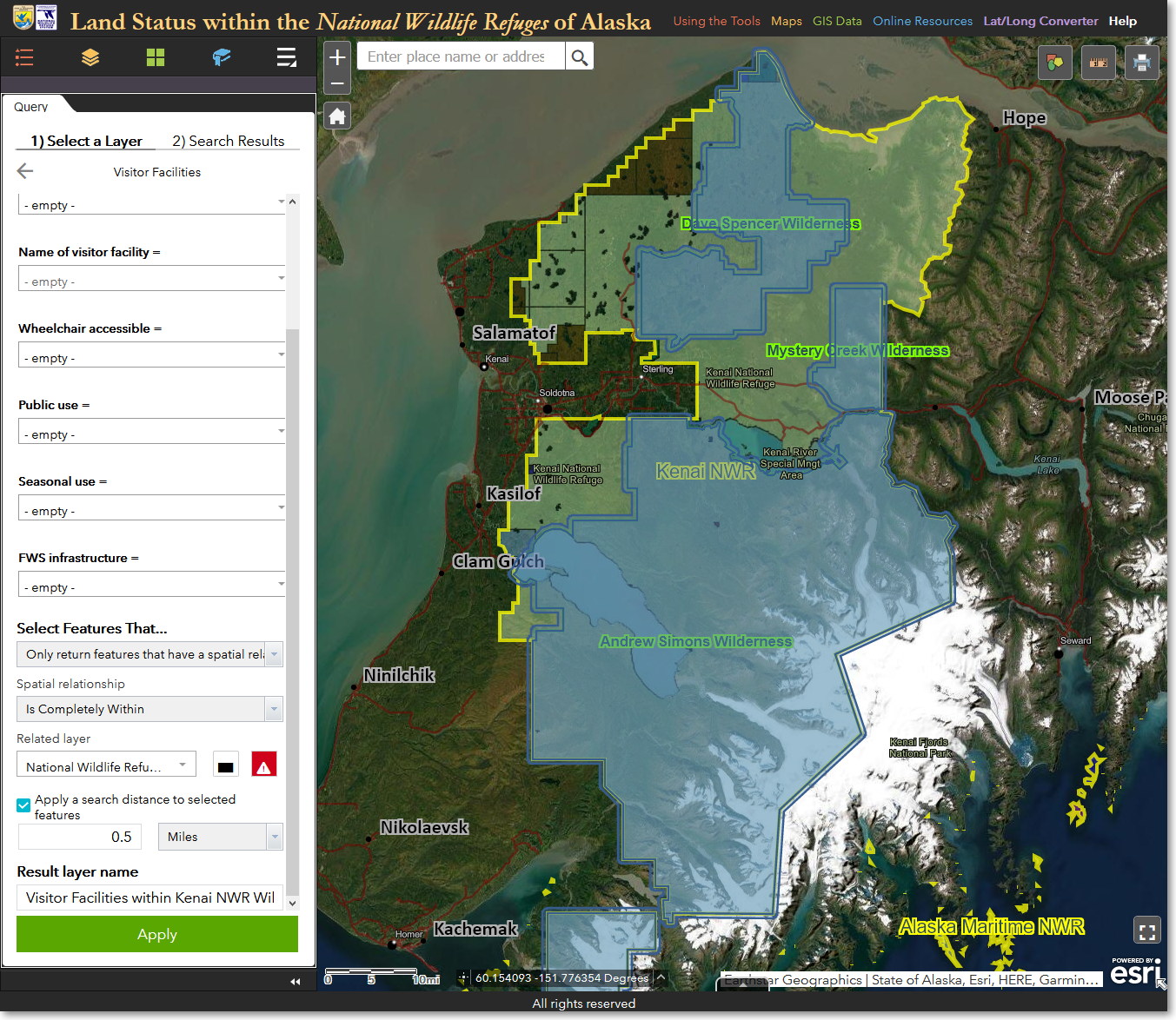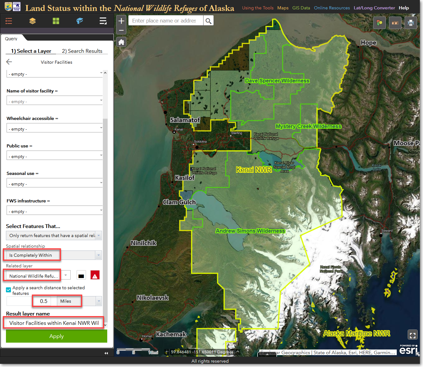 3) If necessary, scroll down so that you can see the additional input fields. For Spatial relationship, select Is Completely Within. For Related layer, select the National Wildlife Refuge Wilderness layer. These query criteria will find all visitor facilities that are completely within wilderness areas. However, there may be some facilities that are just outside the wilderness boundaries, but yet are still associated with the wilderness units. To ensure that you find these facilities, you can apply a buffer, or search distance around the wilderness units. Doing so will find those facilities that may be just outside the wilderness units. For this tutorial, enter a search distance of 0.5 mile. Finally, specify a unique name for the results of the query. The name you specify will be the name that displays in the Mapper's Layers and Query Results panels. For the Result layer name, enter Visitor Facilities within Kenai NWR Wilderness. Your inputs should be as follows: