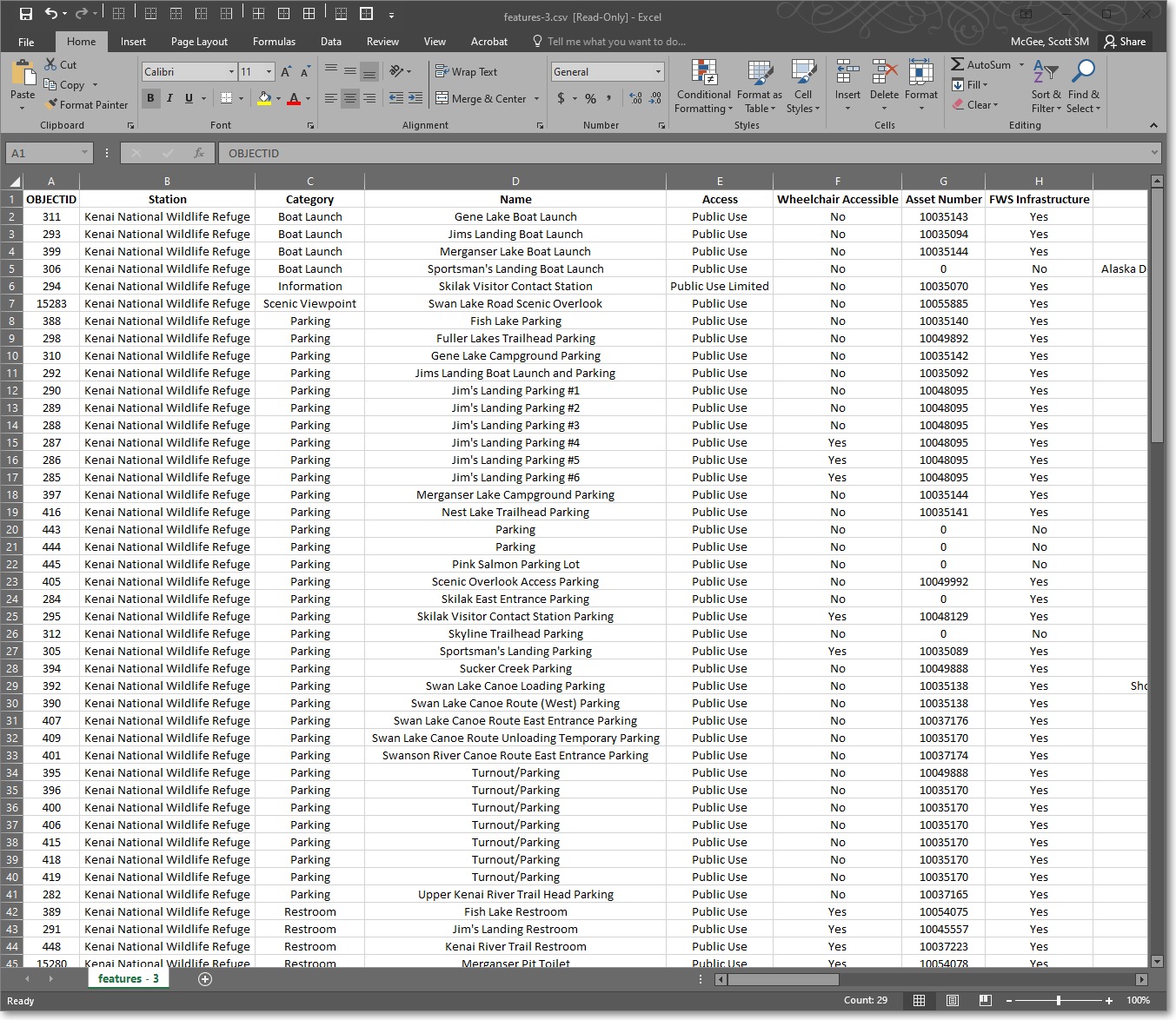 7) You now have a list of all the visitor facilities within the three Kenai NWR wilderness areas, along with detailed information about each facility. You can do additional sorting and analysis on the list using your spreadsheet program's features.