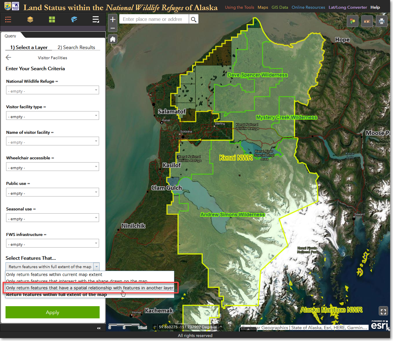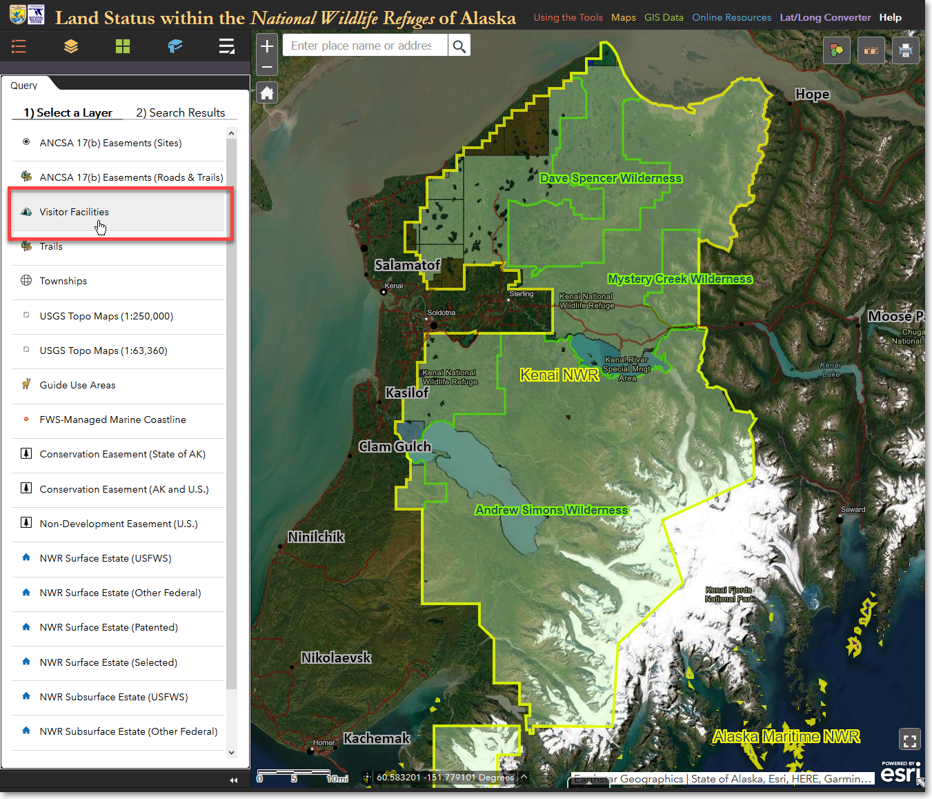 1) With the Query panel open, under 1) Select a Layer, click on the Visitor Facilities layer. This layer contains all of the visitor facilities for all National Wildlife Refuges in Alaska.