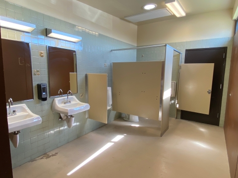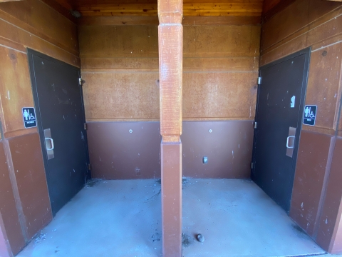 The Education Shelter connected to the upper parking lot has accessible bathrooms that can be entered from the outside of the building and are open from dawn to dusk. The doors are manually opened (not powered).