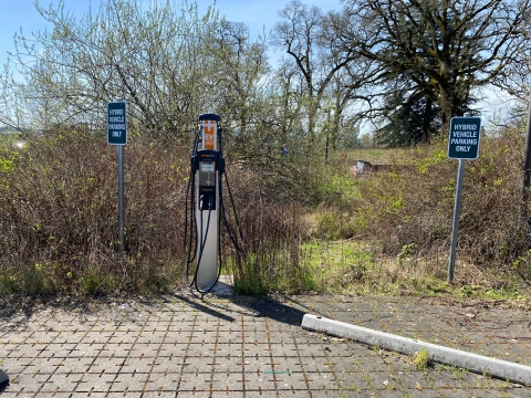 Close to the Visitor Center and trailhead are a small number of dedicated parking spots for electric and hybrid vehicles, along with one Chargepoint charging station that has connections for two electric vehicles.