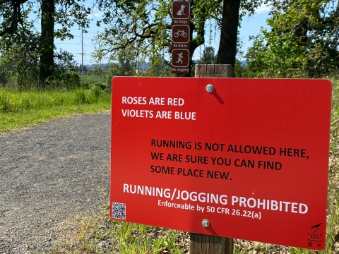 Running and jogging are not allowed at the refuge as the faster pace causes a greater disturbance to wildlife. Several locations in nearby Sherwood, Tualatin, and Tigard have wonderful paths for running and jogging.